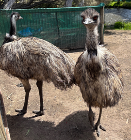 EMU 和名:エミュー 学名:Emu 英名:Dromaius novaehollandiae 綱: 鳥綱 目: ダチョウ目 科:ヒクイドリ科 頭胴長/体重: 体長1.5-2m(メスはオスよりやや大きい) 体色: 生息域: オーストラリア全域に生息する 体長1.5-2m(メスはオスよりやや大きい)になるオーストラリアで最も大きい走鳥類。この原始的な走鳥類には、ダチョー、ヒクイドリ、キーウィーが含まれる。Emuという語源は、ポルトガル語の"Ema"という言葉からきており、"大きい鳥"という意味。飛べない鳥のため、外敵に襲われるとジグザグに走って逃げるか(時速50kmをマークできる)、足で攻撃する場合もあります。繁殖時期は、5-6月で濃い緑色の卵を5-20個産みます。ここからオスが8-10週間かけて卵を温めて、ヒナを孵します。この間、オスはほとんど動かないためかなりの体重を減らすことになります。雛が孵っても、子供達は最高2年くらいオスと一緒に生活します。 |
