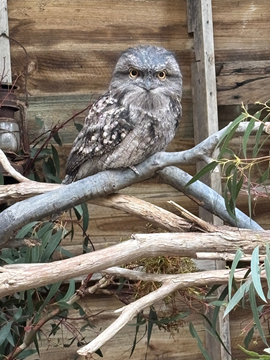 TWANY FROGMOUTH 和名:オーストラリアガマグチヨタカ 学名:Podargus strigoides 英名:Tawny Frogmouth(別名:Frogmouth-Owl) 綱: 鳥網 目: ヨタカ目 Caprimulgiformes 科: オーストラリアガマグチヨタカ科 Podargidae 頭胴長/体重:体長:33-50cm(オスはやや大きめ) 体色:薄いグレーから濃いグレー色、目はオレンジ色 生息域:オーストラリア全土の森林地帯 オーストラリアにいる3種のFrogmouthのうち、一番沢山いる種類(世界には全14種のFrogmouthが生息、主に東南アジア)。カムフラージュがうまく、日中に見るとまるで木の枝の一部にしか見えないほどうまい。フクロウと同じく夜行性。餌は、小さい昆虫・カエル・トカゲ類等。8月から12月の繁殖時期に2個の丸い白い卵を産む。 |